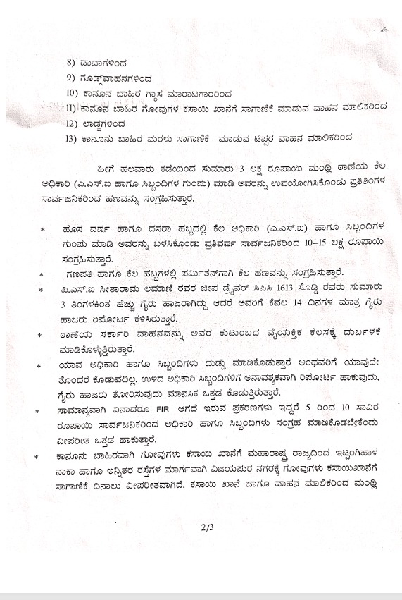 ಠಾಣೆಯಲ್ಲಿ ದಾಖಲಾಗುವ ಎಫ್‌ಐಆರ್, ದೂರುದಾರರಿಂದ 10,000 ರೂ.ಯಿಂದ 1 ಲಕ್ಷ ರೂ.ವರೆಗೆ ಸಿಬ್ಬಂದಿ ಹಣ ವಸೂಲಿ ಮಾಡಬೇಕು ಎಂದು ಒತ್ತಡ ಹೇರಿದ್ದಾರೆ. ಇನ್ನು ಹಣ ವಸೂಲಿಗೆ 5.0 ಕೋಡ್ ಅಂದ್ರೆ 50,000 ರೂ. ಹೀಗೆ ಕೋಡ್ ಬಳಸಿ ಹಣ ವಸೂಲಿ ಮಾಡಲು ಒತ್ತಡ ಹೇರುತ್ತಿದ್ದಾರೆ. ಇದರ ಜೊತೆಗೆ ಬಾರ್, ಸ್ಪಾ, ಸಿಗರೇಟ್ ಹಾಗೂ ಮಾವಾ (ತಂಬಾಕು), ವೇಶ್ಯಾವಾಟಿಕೆ ಸೇರಿದಂತೆ ಅನೇಕ ವ್ಯವಹಾರಗಳಿಂದ ವಸೂಲಿಗೆ ಒತ್ತಡ ಹೇರುತ್ತಿದ್ದಾರೆ ಎಂದು ತಿಳಿಸಿದ್ದಾರೆ.
