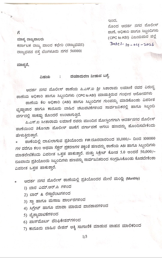 ವಿಜಯಪುರ: ನಗರದ ಆದರ್ಶನಗರ ಪೊಲೀಸ್ ಠಾಣೆಯ ಪಿಎಸ್‌ಐ ಸೀತಾರಾಮ್ ಲಮಾಣಿ ಭ್ರಷ್ಟಾಚಾರ ಕಿರುಕುಳಕ್ಕೆ ಬೇಸತ್ತು ಸಿಎಂ, ಗೃಹಸಚಿವ ಸೇರಿದಂತೆ ಹಿರಿಯ ಪೊಲೀಸ್‌ ಅಧಿಕಾರಿಗಳಿಗೆ ಠಾಣಾ ಸಿಬ್ಬಂದಿ ಹಾಗೂ ಅಧಿಕಾರಿಗಳು ಸಾಮೂಹಿಕ ದಯಾಮರಣ ಕೋರಿ ಪತ್ರ ಬರೆದಿದ್ದಾರೆ.