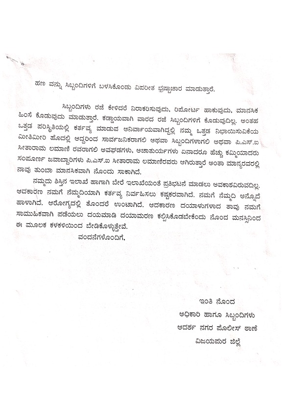 ಪಿಎಸ್‌ಐ ಲಮಾಣಿ ಆದರ್ಶನಗರ ಪೊಲೀಸ್ ಠಾಣೆಯಿಂದ ತಿಕೋಟ ಪೊಲೀಸ್ ಠಾಣೆಗೆ ವರ್ಗಾವಣೆಗಾಗಿ ಹಣ ಹೊಂದಿಸುತ್ತಿದ್ದಾರೆ.ಹೀಗಾಗಿ ಹಣಕ್ಕಾಗಿ ವಿಪರೀತ ಭ್ರಷ್ಟಾಚಾರ, ಕಾನೂನು ಬಾಹಿರ ಚಟುವಟಿಕೆಗಳಿಂದ ಸಾರ್ವಜನಿಕರಲ್ಲಿ ಹಾಗೂ ಸಿಬ್ಬಂದಿ ವರ್ಗದಲ್ಲಿ ಪಿಎಸ್‌ಐ ತೊಂದರೆಯುಂಟು ಮಾಡುತ್ತಿದ್ದಾರೆ.